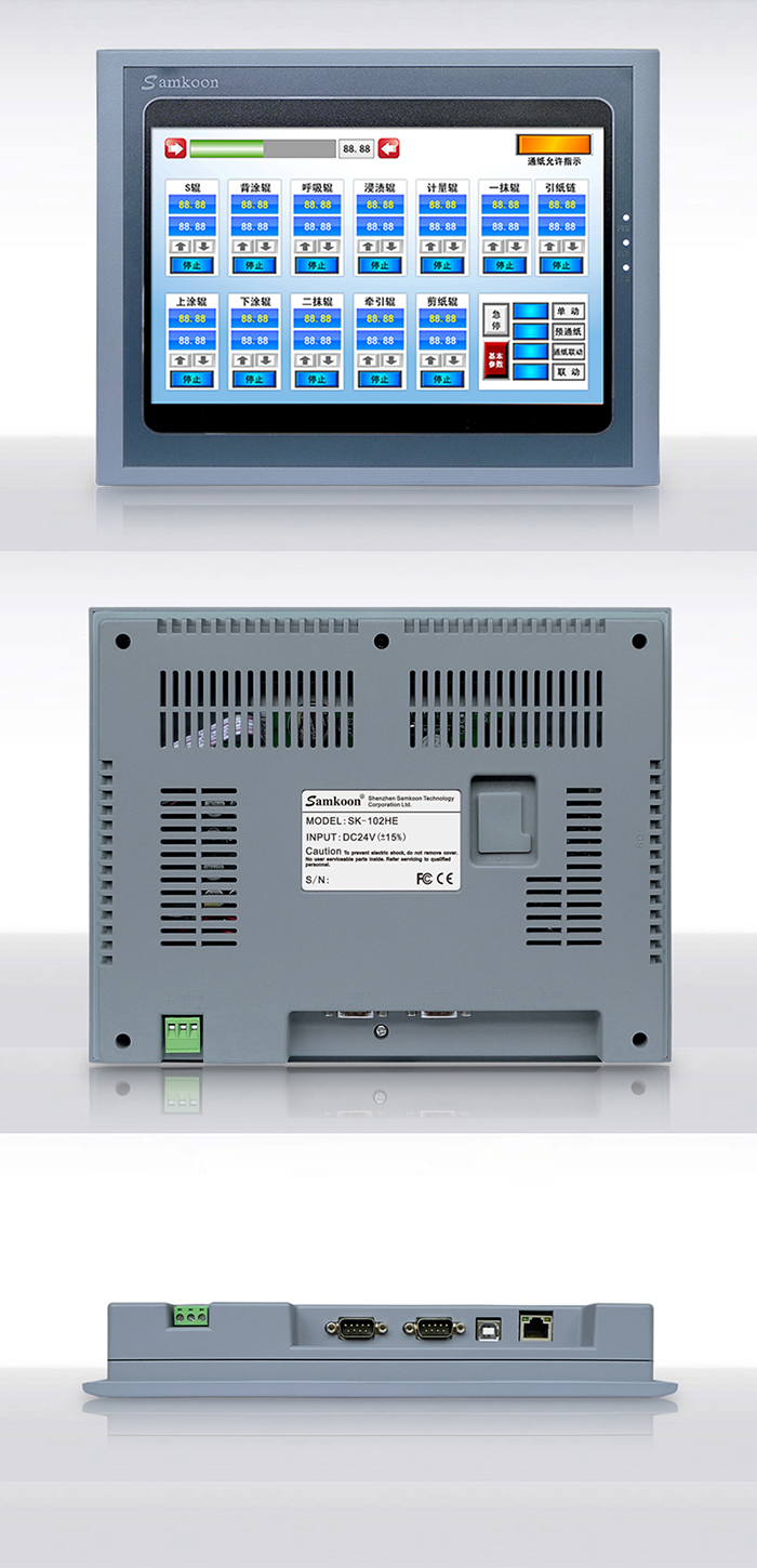 Samkoon SK系列觸摸屏是一款基于Linux系統(tǒng)的人機(jī)界面,符合EN55022和EN55024標(biāo)準(zhǔn),符合FCC、CE、Class A,具有很強(qiáng)的抗干擾能力,符合工業(yè)環(huán)境的電磁兼容要求。該款產(chǎn)品配備有高性能的Cortex A8處理器,及高容量FLASH,可存儲(chǔ)大量數(shù)據(jù),實(shí)現(xiàn)數(shù)據(jù)斷電不丟失;支持U盤存儲(chǔ),可以實(shí)現(xiàn)數(shù)據(jù)的導(dǎo)入導(dǎo)出、工程更新及配方更新功能;支持在線及離線模擬,可直接從PLC中獲取數(shù)據(jù);支持串口打印機(jī),顯現(xiàn)畫面及數(shù)據(jù)打印;支持一屏多機(jī),實(shí)現(xiàn)最大連接32個(gè)PLC或智能設(shè)備;支持多國(guó)語(yǔ)言,可實(shí)現(xiàn)5種語(yǔ)言任意切換;支持以太網(wǎng)通訊下載功能。