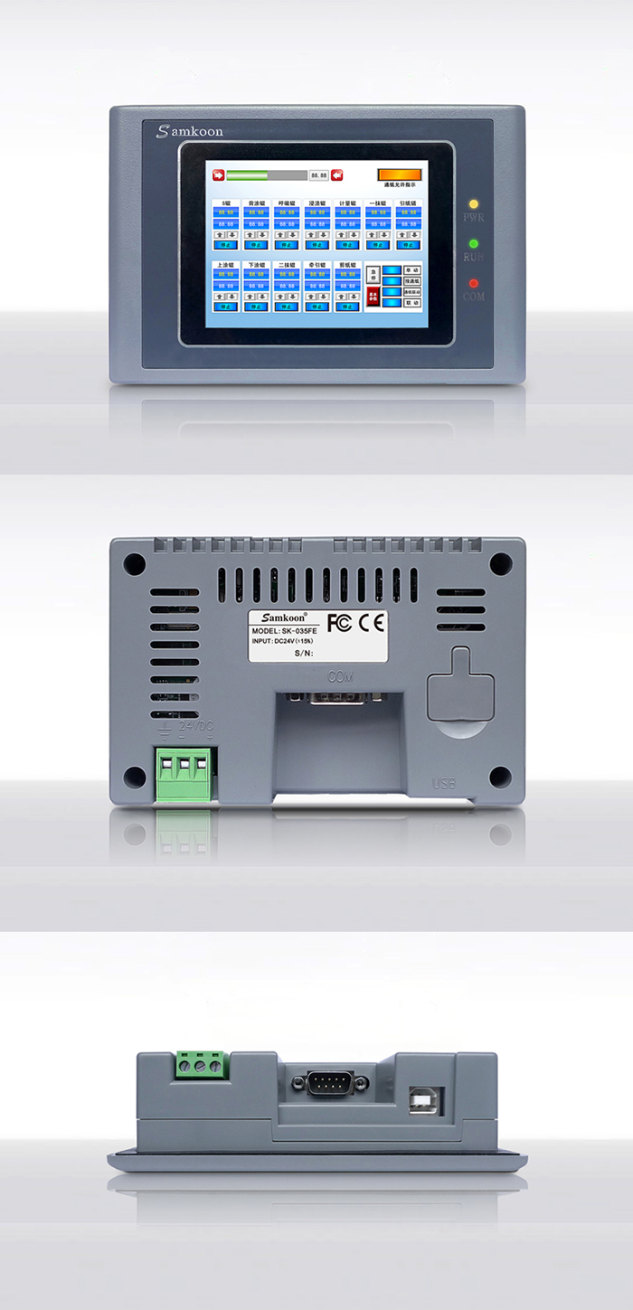 Samkoon SK系列觸摸屏是一款基于Linux系統(tǒng)的人機(jī)界面,符合EN55022和EN55024標(biāo)準(zhǔn),符合FCC、CE、Class A,具有很強(qiáng)的抗干擾能力,符合工業(yè)環(huán)境的電磁兼容要求。該款產(chǎn)品配備有高性能的Cortex A8處理器,及高容量FLASH,可存儲(chǔ)大量數(shù)據(jù),實(shí)現(xiàn)數(shù)據(jù)斷電不丟失;支持U盤(pán)存儲(chǔ),可以實(shí)現(xiàn)數(shù)據(jù)的導(dǎo)入導(dǎo)出、工程更新及配方更新功能;支持在線及離線模擬,可直接從PLC中獲取數(shù)據(jù);支持串口打印機(jī),顯現(xiàn)畫(huà)面及數(shù)據(jù)打?。恢С忠黄炼鄼C(jī),實(shí)現(xiàn)最大連接32個(gè)PLC或智能設(shè)備;支持多國(guó)語(yǔ)言,可實(shí)現(xiàn)5種語(yǔ)言任意切換;支持以太網(wǎng)通訊下載功能。