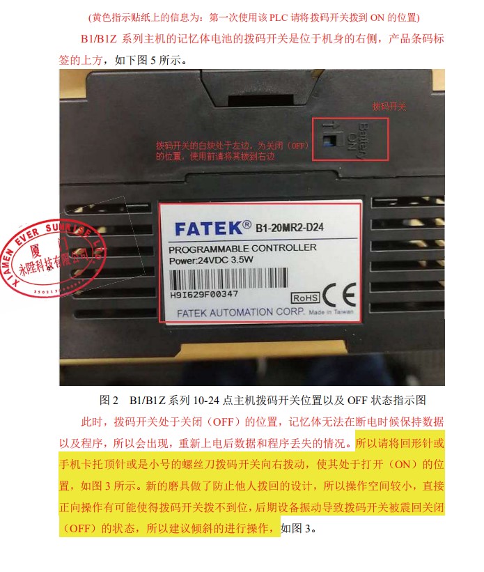 請務(wù)必將此撥碼開關(guān)撥到 ON 的位置,否則會(huì)導(dǎo)致程序、數(shù)據(jù)丟失等影響,耽誤您的設(shè)備運(yùn)行。為了防止在運(yùn)輸過程中,黃